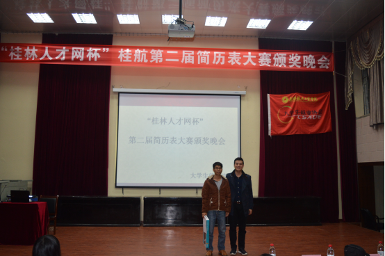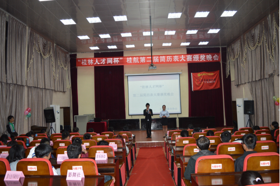 style="line-height:150%;text-indent:38px">2015年11月10日晚上7:00,桂林航院“第二届个人简历表制作大赛”颁奖晚会于电教馆盛大举行,莅临本次颁奖晚会的嘉宾有管理学院潘小玲老师、招生就业处科长李智老师及各组织社团代表。