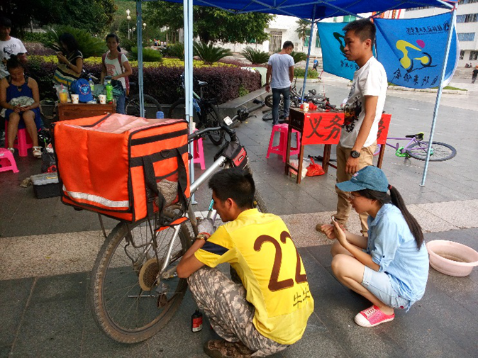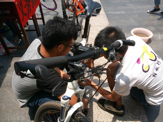 活动从早上9点钟正式开始,设点在青春广场,很多路过的同学都纷纷过来进行学习,以及把他们心爱的自行车交到我们的手里,让我们能够有机会为他们服务。今天烈日当空,桂航自行车协会的成员,顶着烈日,积极的完成义务维修的工作。活动一直持续到下午的5点钟。期间有很多的小伙伴们过来修车,和了解一些有关自行车维修的相关知识。