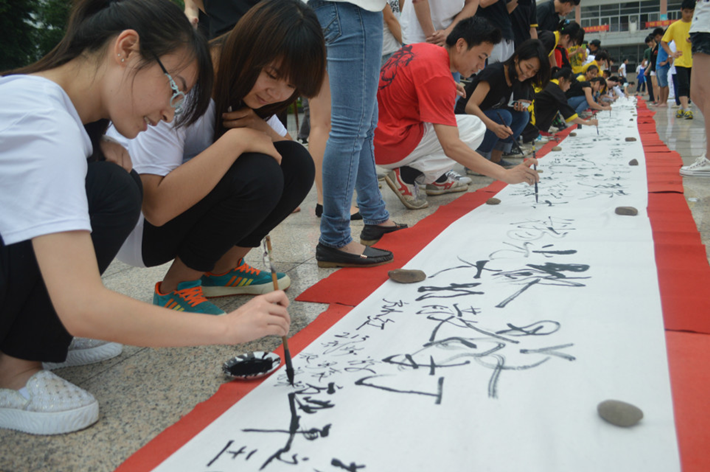 与此同时,广场旁边全校师生挥毫长卷书法,在《游子思乡阁》《励志奋斗阁》《友情万岁阁》《爱情不渝阁》四块区域抒发感情,场面壮观。