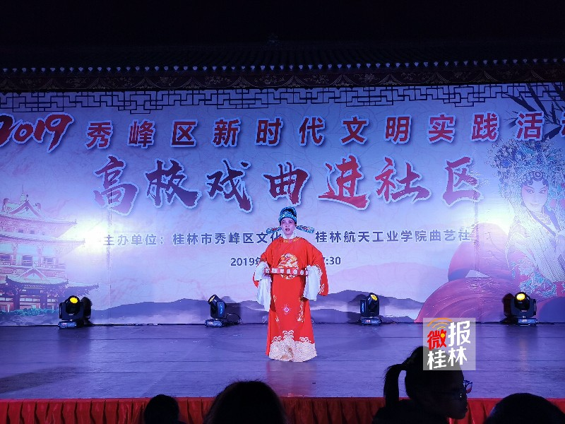 “为救李郎离家园,谁料皇榜中状元。中状元着红袍,帽插宫花好哇、好新鲜哪……”在一曲《女驸马》选段《谁料皇榜中状元》中,高校戏曲进社区活动拉开序幕。之后,京剧《空城计》选段《我正在城楼观山景》、《梨花颂》,评剧《谢瑶环》选段《忽听得堂上一声喊》,文场《漓江烟雨》和彩调《油茶情歌》等不同戏曲种类的经典曲目给现场观众带来了精彩的听觉体验。此外,戏歌《定军山》、京剧表演唱《我是中国人》和戏曲水袖舞《云裙水袖》又让观众感受到不一样的戏曲文化。