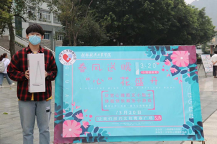 疫情期间,为进一步提高大学生的心理素质,促进大学生的身心健康,PA视讯官网游戏大学生心理健康协会在沈赛丽老师、梁珊珊老师和秦懿恬老师的带领下于3.20心理健康周活动在北校青春广场举办“春风送暖,‘心’花盛开”的主题活动。