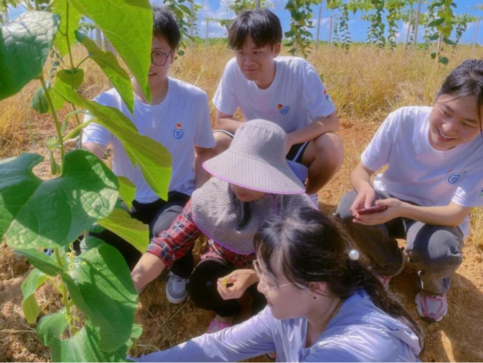 最后,实践调研团队来到了永福县罗汉果产业示范园。示范园王阿姨介绍罗汉果的种植方式和管理技术,让实践调研团队大开眼界。为了确保罗汉果的品质和产量,种植基地采用了科学的种植方法,包括去芽、点花等精细操作。去芽可以有效控制罗汉果的生长速度和形态,使其更加健壮;而点花则是提高坐果率的关键步骤,通过人工授粉的方式,大大提高了罗汉果的结实率。