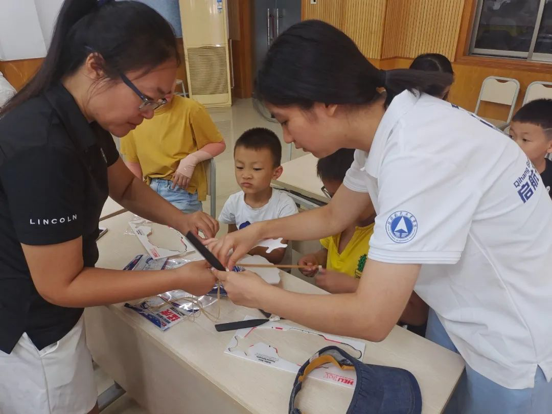 (图为团队成员们耐心地解答小朋友们制作飞机模型过程中的疑问,协助他们一起完成手工)