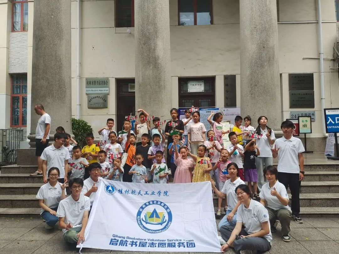 (图为团队成员们和小朋友们在广西桂林图书馆榕湖分馆大门前的合影)