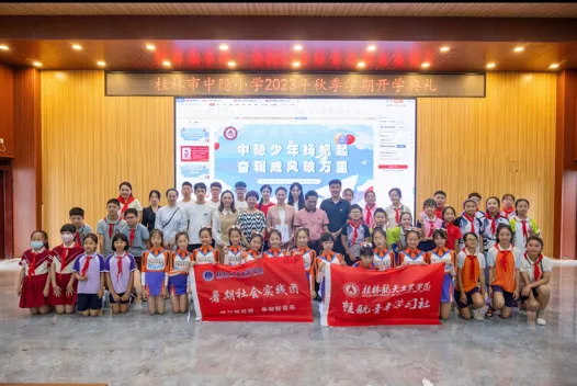 2023年8月28日,桂林市秀峰区中隐路中隐小学举行2023年秋季学期开学典礼。PA视讯集团网站青年学习社—红蓝引航团队的老师与同学来到中隐小学参与“童心向太空,共筑航天梦”宣讲进校园活动,宣讲航天精神,促进学生们的奋斗精神与爱国热情进一步提升。