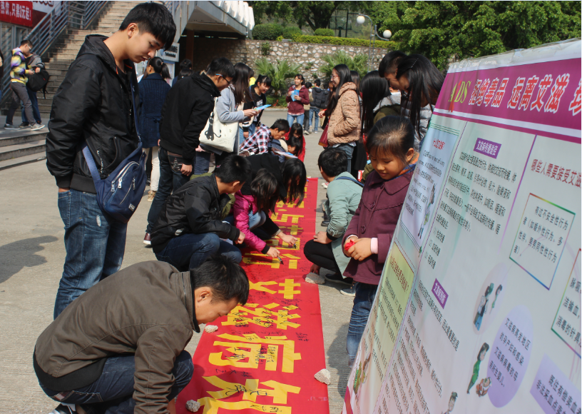 12月1日,由桂林市疾病预防控制中心和我院团委、卫生院共同组织的“高校防艾千人签名”活动在我院北校区举行,百余名大学生在防艾志愿者签名板上签上了自己的姓名,还在横幅上留下了对艾滋病患者的祝福语及对预防艾滋病的决心。呼吁我院学生增强预防艾滋病的意识,同时消除对身边艾滋病患群体的歧视。活动现场,工作人员向路过的同学们派发了防艾宣传册。