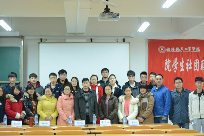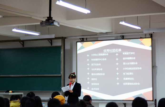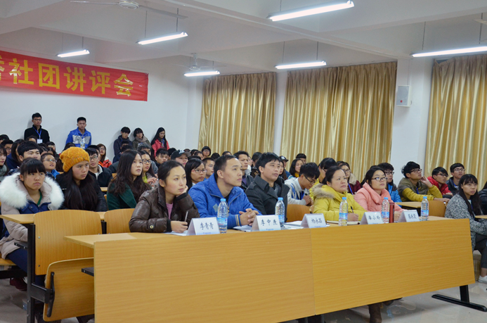 2014年12月12日晚19:30分,2014年年度优秀社团展评会在南综317教室开展。莅临本次活动的嘉宾有:杨永昌书记、潘小玲老师、李中焘老师、蔡东霞老师和李青青老师,以及各个优秀社团的代表。