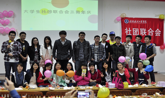 2014年4月29日晚,桂林航院大学生社团联合会“三周年”庆典于一教1423盛大举行。本次庆典有幸地请到了我社团联第二届主席常阳学长、信息部长陈君泽学长、外联部长赵桂兴学长,以及第三届的学长学姐们。