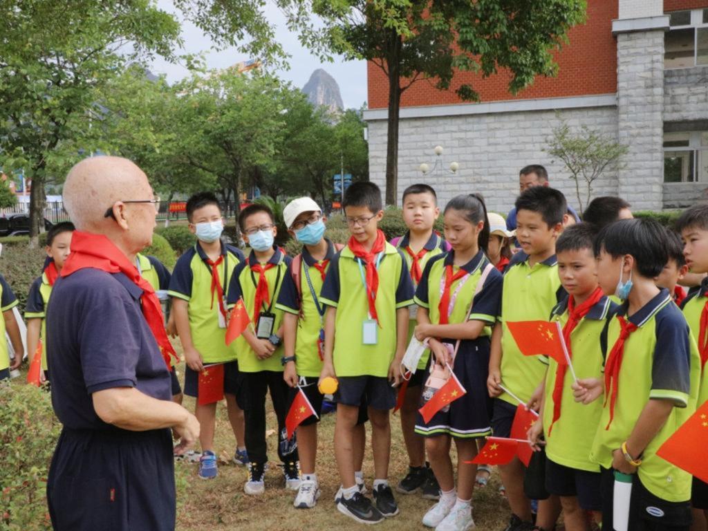 图为李告发为小朋友们讲解学校历史