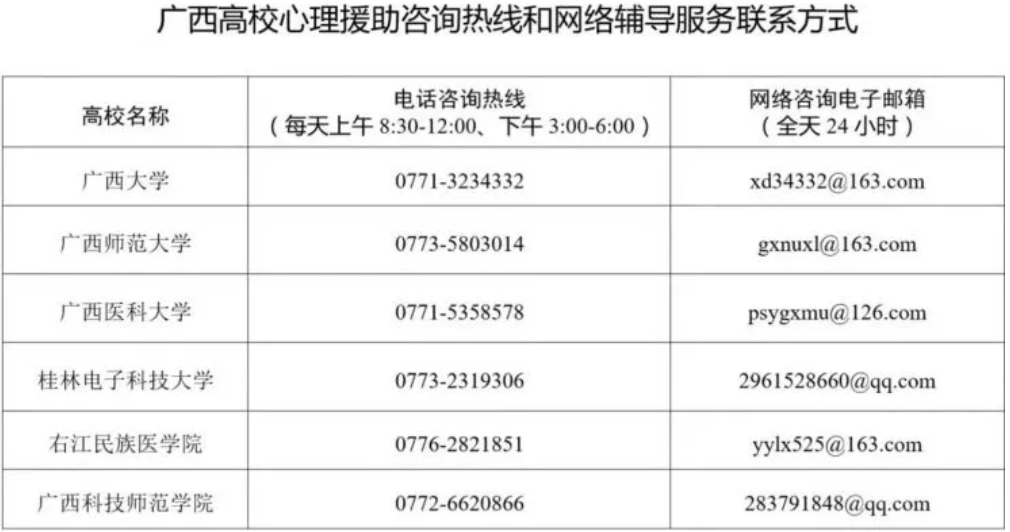 为帮助社会大众和广大师生以更加理性平和的心态应对新型冠状病毒感染的肺炎疫情,中共广西壮族自治区委员会教育工作委员会、广西壮族自治区教育厅组织区内有关高校心理健康教育与咨询中心的专家教授组成专业的心理支持团队,在疫情防控期间为广西社会大众和广大师生免费提供心理援助电话咨询和网络辅导服务。