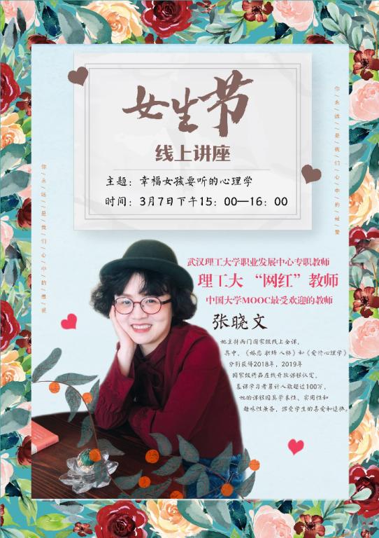 3月7日下午,武汉理工大学职业发展中心、中国大学MOOC最受欢迎的张晓文老师为PA视讯官网游戏同学们带来了一场以“幸福女孩要听的心理学”为主题的线上直播讲座。